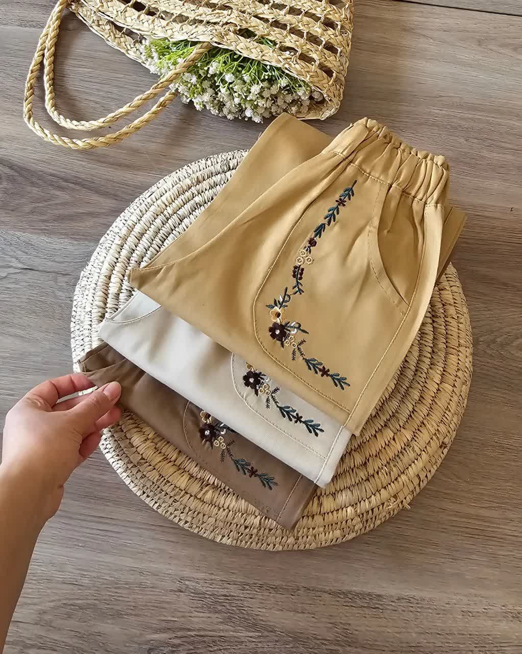 جیب های شلوار گلدوزی دارد. کمر شلوار کش دارد. پایین شلوار چین دارد.